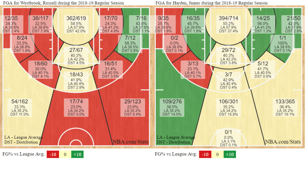 Both players shoot the ball a lot, but the main difference between Westbrook and Harden is how efficient they were in their attempts. Per NBA.com/stats, not only is Harden more efficient than Westbrook in nearly every major spot on the floor, as seen in both shooting charts, but Harden also attempted more free throws at a better percentage than Westbrook (11 FTA at 87.9% vs 6.2 FTA at 65.6%). So no matter which role either player plays, the limiting factor for the Rockets will end up being how well Westbrook will shoot the ball this coming season.